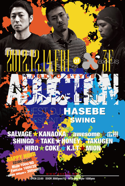 管理人様告知失礼します。 12/14(金)に渋谷axxcisにて毎週金曜日開催のBIG PARTY「TOKYO STYLE」が開催されます。 エントランスにてタケのゲストで「コウ」と言って頂ければ何名でも格安なゲスト料金でご入場できますのでご利用ください♪ 今月は約2年半に渡り第2金曜の渋谷axxcisを盛り上げてきた3F『ADDICTION』がラストを迎えるということで、RESIDENTのDJ SWINGはもちろんのことDJ HASEBEがGUEST DJとして一夜限りの出演をいたします。 さらに2F『PLAYERZ PARK』のGUEST DJにはDJ KOMORI、DJ INOUEを迎え、 一層の盛り上がりを見せる