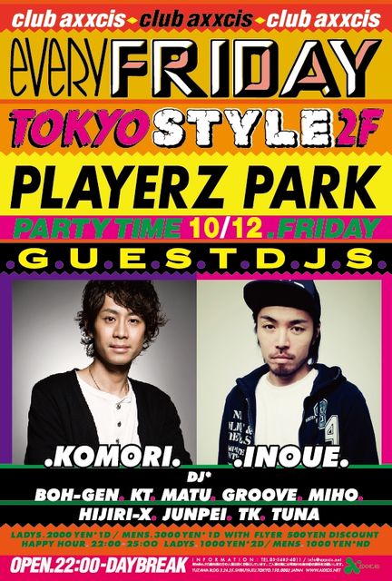 管理人様告知失礼します。 12/14(金)に渋谷axxcisにて毎週金曜日開催のBIG PARTY「TOKYO STYLE」が開催されます。 エントランスにてタケのゲストで「コウ」と言って頂ければ何名でもゲスト料金でご入場できますのでご利用ください♪ 今月は約2年半に渡り第2金曜の渋谷axxcisを盛り上げてきた3F『ADDICTION』がラストを迎えるということで、RESIDENTのDJ SWINGはもちろんのことDJ HASEBEがGUEST DJとして一夜限りの出演をいたします。 さらに2F『PLAYERZ PARK』のGUEST DJにはDJ KOMORI、DJ INOUEを迎え、 一層の盛り上がりを見せること間
