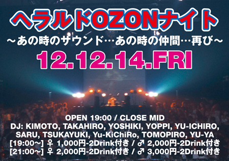ヘラルドOZONナイト 〜あの時のサウンド…あの時の仲間…再び〜 ■日時: 12月14日第2金曜日 ■会場: BECOME SAKAE OZON ■OPEN 19:00 / CLOSE MID ■DJ: KIMOTO TAKAHIRO YOSHIKI YOPPI YU-ICHIRO SARU TSUKAYUKI Yu-KiChiRo TOMOPIRO YU-YA ■VJ: UE-PON ■STAFF: ジョー 今辻 宮下 佐藤 他、只今調整中(笑) ■料金: [19:00〜] ♀ 1,000円-2ドリンク付き ♂ 2,000円-2ドリンク付き [21:00〜] ♀ 2,000円-2ドリンク付き ♂ 3,000円-2ドリンク付き 伝説のイベントが満