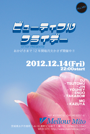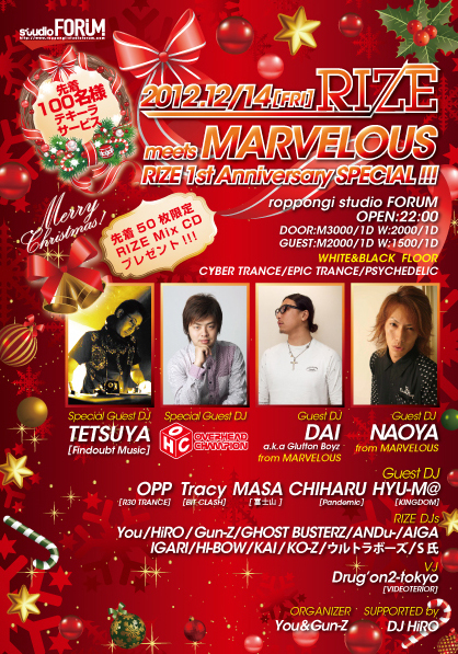 毎月第二金曜は六本木で活躍中の若手DJを集めたTRANCE系中心のALL GENRE PARTY『 RIZE 』。今回のRIZEは、2012年最後にして1周年!1年間の感謝を込めて史上最高のラインナップでお送りいたします。総勢25人以上のBack to Back DJ!