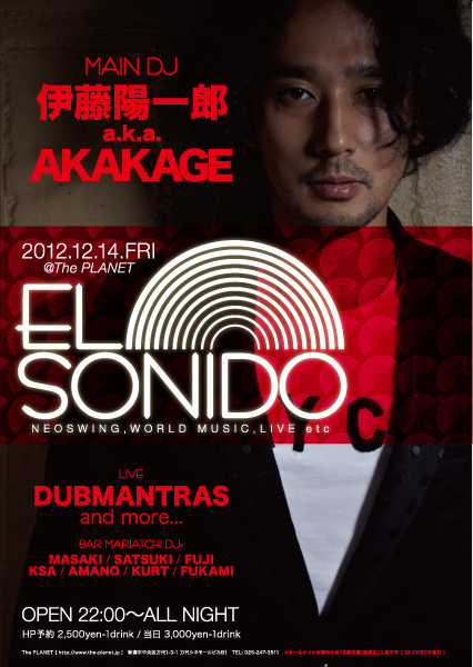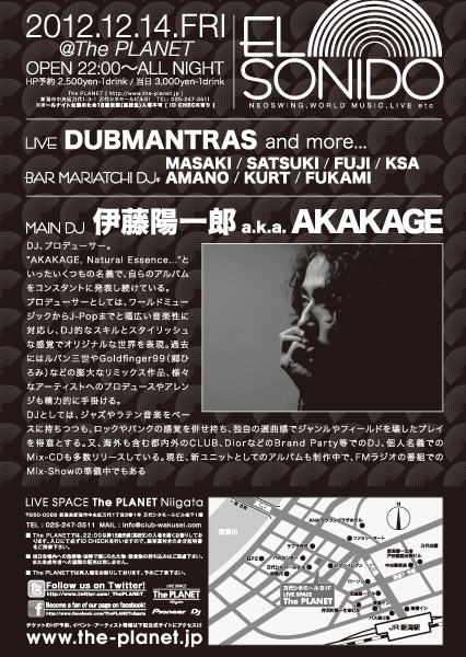 ★12/14(金) [ EL SONIDO ] - MAIN DJ - 伊藤陽一郎 a.k.a. AKAKAGE - LIVE - DUBMANTRAS - DJ - MASAKI(BAR MARIATCHI) SATSUKI(BAR MARIATCHI) FUJI(BAR MARIATCHI) KSA(BAR MARIATCHI) AMANO(BAR MARIATCHI) KURT(BAR MARIATCHI) FUKAMI(BAR MARIATCHI) ♪NEOSWING,WORLD MUSIC,LIVE etc... OPEN 22:00〜ALL NIGHT HP予約 2,500yen-1d 当日 3,000yen-1d @The PLANET [ http://www.the-planet.jp ] 新潟市中央区万代1-3-1 万代シネモールビルB1 TEL: 025-247-3511 ※オールナイト公演のため18歳未満(高校生)入場不可