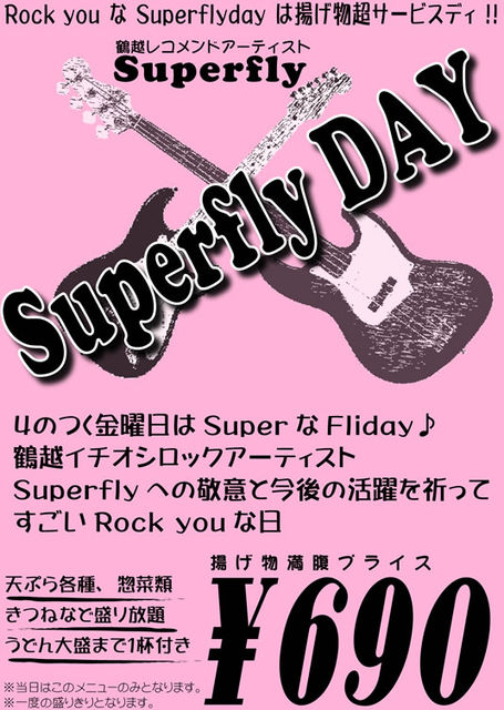 実は私たち夫婦、Superflyが大好きなのであります。 JAZZはBGMでいつも聴いているので、もちろん大好きなのですが、ライブの疾走感、パワフルなボーカル、聴き込むほどに、またライブDVDなど観るほどに魅了され続けているアーティストがSuperflyなのですね〜♪ そ・こ・で♪ ダジャレな「SuperflyDAY」を企画しました。 Superfly越智志帆ちゃんのデビューは4月4日(シ・フォー) 今年で5周年、鶴越よりも一年早いデビューでした。(そこは大して関係ない。笑) 2013年に向けて、シフォーの日にちなんで、4の付く金曜日は、Superflyの