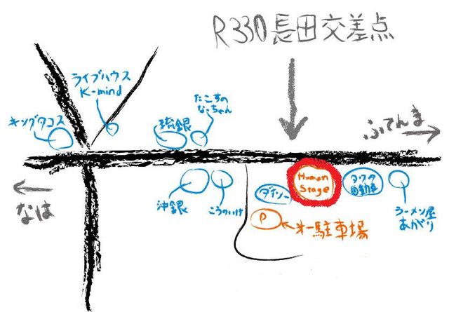 場所:沖縄HUMAN STAGE (ヒューマンステージ) 時間:open 17:30/start 18:00〜 料金:ticket \1500 ACT:おとなのこ/laughsquall/Nuchi/zappy/Rag Rats ------------------------------------------- 宜野湾HUMAN STAGE (ヒューマンステージ) 沖縄県宜野湾市長田1-11-1 http://www.geocities.jp/humanstageginowan/ <アクセス> 最寄りバス停所:長田バス停、下車し徒歩1分 -------------------------------------------