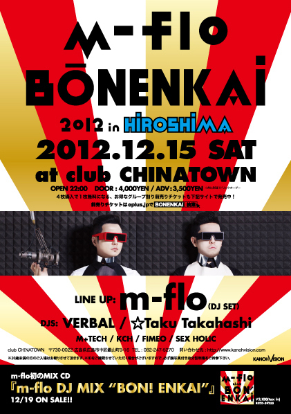 ジャパニーズダンスミュージック(J−POP)やビルボード系クラブミュージックを中心としたポップなパーティーを企画するJ★Tripがお届けする今年最後のビッグパーティー 3月にリリースした約5年ぶりのアルバム『SQUARE ONE』で完全復活をはたしたm-flo。そんな彼らがプロデュースするスペシャルーパーティー『BONENKAI』がなんと広島にて開催決定!!!! Ageha(東京)では毎年動員記録を塗り替える程の超モンスターパーティー。しかもm-floとしては7年ぶりの来広でもあり、東京、大阪、広島のみでのプレミアムな一夜は今年一番の盛り