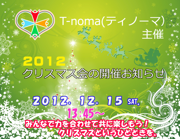 ≪T-noma(ティノーマ)主催 クリスマス会のご案内≫ 寒さが日に日に強まってきている今日この頃、皆さんいかがお過ごしでしょうか。 さて、この度、T-noma(ティノーマ)では、ノーマライゼーション実践企画として、以下の日程と内容で≪T-noma(ティノーマ)主催 クリスマス会≫を開催する運びとなりました。 師走お忙しい時期かと存じますが、もしご都合が合いましたら、奮ってご参加頂きたく、ご案内いたします♪ 障がい当事者が企画、準備した、今までにないクリスマス会です♪ 参加して頂ける方のサポートがあって、初めて実施