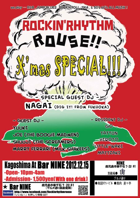 ■2012-12-15 ROCKIN' RHYTHM ROUSE!! "X'mas SPECIAL!!!" -Date- Saturday 15st December 2012 -Open- 10pm-4am -Admission- 1,500yen(with one drink) -Special Guest DeeJay- NAGAI (DIG IT! From FUKUOKA) -Guest DeeJays- YUUKI JOE (THE BOOGIE MADMEN) SHUUJI(THE SCREAMERS) Marry Ferrari(MILK SHAKEES) -Deejays- GO TATTUN(THE SCREAMERS) HIROTO(Bar NINE) "little"WAKI(Original RRR!!) MATTZAKI Kagoshima At Bar NINE 鹿児島