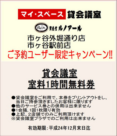 エンカウンター第16回定例会を、12/15(土)に開催致します。 場所:喫茶室ルノアール 市ヶ谷駅前店 マイ・スペース1号室 時間:10:00〜13:00(マイ・スペースは10分前より利用可能) 集合時間:9:45 集合場所:JR総武線市ヶ谷駅改札(地下鉄のりかえ口ではない方です) 料金:\2,200(部屋代 参加人数で割り勘)+飲食代(各自実費負担) 添付のチラシをプリントアウトして持参することで、部屋代が1時間無料になります。 自分が持って行く予定ですが、参加される方は一応持ってきていただけると助かります。 初めて利用する