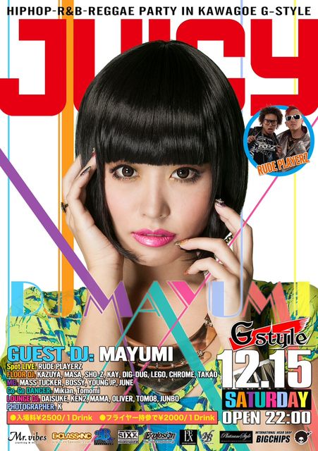 管理人様告知失礼いたします。 川越G-Styleにて二ヶ月に一度のBIG PARTY!!!!! 毎回かなりの動員数で盛り上がっております★ 今回はGuestにDJ MAYUMI★ そして緊急参戦RUDE PLAYERZ!!!!!!!!!! 今年最後の大祭りです!!!!!!!! エントランスにて(YOUNG JPのゲスト)と言って頂きますとディスカウント料金で入れます★ 【JUICY】 =========================================================== 偶 数月第3土曜は埼玉NO.1 HIPHOP/R&B PARTY 『JUICY』!!! "PARTYを心から楽しんでもらう"をコンセプトに出演者の考え重視のPARTYが 多い中