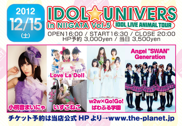 管理人様、告知失礼致します。 ★12/15(土) [ IDOL☆UNIVERSE in NIIGATA Vol.5 ] IDOL LIVE ANIMAL TOUR - IDOL LIVE - 小桃音まいにゃ いずこねこ Love La Doll w2w×Go!Go!ぱわふる学園 Angel "SWAN" Generation ●終演後に物販、チェキ撮影会アリ ♪アイドルライブ OPEN16:00 / START16:30 / CLOSE 20:00 前売&HP予約 3,000yen 当日 3,500yen