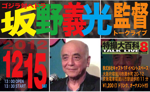 管理人様、宣伝の書き込みご容赦ください。 お馴染み「特撮大百科トークライブ8」開催のお知らせです。 今回の特別ゲストは「ゴジラ対ヘドラ」の坂野義光監督! ゴジラシリーズ最大の異色作ともいわれ、その独特の作風から 今も根強いファンが多い「ゴジラ対ヘドラ」。 同作の演出を担当した坂野監督自らが語る公開41年目の真実とは…! いつものようにみっちり時間をとって、坂野監督から貴重な秘話逸話の 数々をお聞きします。 ひっとすると気になるあの新作の話題が飛び出すかも!? 走るゴジラの放射能、光るヘドラの熱線銃! 年末