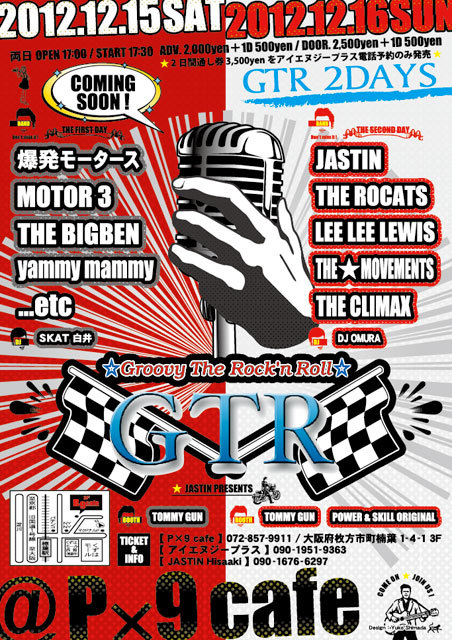 管理人様 告知させてください。 来る12月15日(土)16日(日)今回2daysでやります! 大阪は枚方の京阪楠葉(くずは)にあります P×9cafe(ピーナインカフェ)で恒例のロケンロイベント JASTIN PRESENTS Groovy The Rock'n Roll 〜GTR〜 前売り 2,000yen+1D 500yen 当日券 2,500yen+1D 500yen 2日間通し券 3,500yen(ドリンク代別) ※通し券につきましてはアイエヌジープラス電話予約のみになります※ OPEN 17:00 START 17:30 15日出演バンド・DJ・ブース 爆発モータース THE MOTOR 3 THE BIGBE