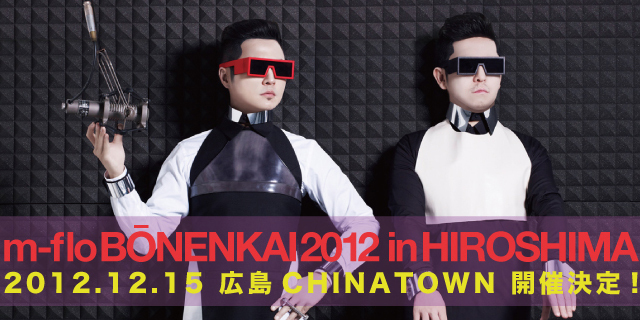 今年3月に約5年ぶりとなるアルバム『SQUARE ONE』をリリースしたm-flo。数々の豪華ボーカリストを迎えながら、ボーカリストの情報を一切公開しないというスタイルでオリコンチャートにチャートインし、今年世間を賑わせたm-floが... 東京では恒例となった冬の風物詩「m-flo BŌNENKAI」を、広島CHINATOWNで開催!! 2012.12.15(土) m-flo BŌNENKAI 2012 in HIROSHIMA at club CHINATOWN 22:00 OPEN予定 前売り3500円:当日4000円(共に別途1オーダー) 4枚購入で1枚無料キャンペーンも実施! 前売りチケットに関してはeplus.jp