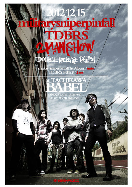 militarysniperpinfall 1st Album 「suite」が 12/19にsleepwalk recordsより全国発売決定!! それに伴い12/15 立川BABELにて先行レコ発として TDBRSとの2MAN SHOWを開催します。 ※TDBRSもこの日より新音源リリースです! ■12/15(sat) 立川BABEL militarysniperpinfall x TDBRS 2MAN SHOW OPEN/START 18:00/19:00 ADV/AT DOOR ¥2000/¥2500 -with- TDBRS BABEL : 042-595-9020 ◆現在、会場の立川BABELでは先着80名様に 特製タオル付きチケットを販売中(無くなり次第終了) ※ソールドアウトという意味ではありませ