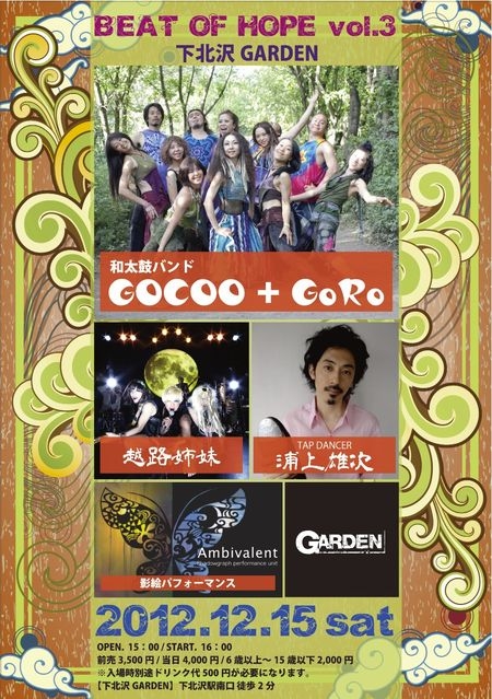 『BEAT OF HOPE vol.3」GOCOO+GoRo LIVE 越路姉妹 フルメンバーで 参戦します!!! また 越路姉妹×GOCOOのコラボもあり!!! 【日程】12月15日(土) 【時間】OPEN  15:00〜     START 16:00〜 【場所】下北沢GARDEN     東京都世田谷区北沢2-4-5 mosia B1F 【アクセス】小田急線下北沢駅       京王井の頭線下北沢駅南口より徒歩2分 【共演】 越路姉妹      浦上雄次(TAP)      Ambivalent(影絵パフォーマンス) 【チケット】前売り:3,500円       当 日:4,0