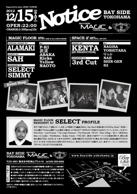 管理人様告知失礼します! 12/15 (SAT) 『Notice』 @ BAYSIDE YOKOHAMA -MAGIC & SPACE if- -------------- 横浜最大級のクラブ『BAYSIDE YOKOHAMA』のMAGICとSPACE ifのフロアにて偶数月第3土曜日に開催の大人気DJ ONLY PARTY『Notice』!! 【MAGIC】のSPECIAL GUESTには世界のクラブシーンを意識したプレイスタイルで都内を軸にワールドワイドに活躍するDJ ALAMAKI!さらにGUESTには数々のBIG EVENTでフロアを熱気の渦に巻き込んでいるDJ SAHが登場! RESIDENTには東京・横浜を中心に幅広い活躍で頭角を表している