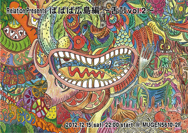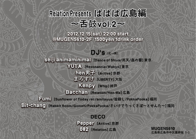 Relation Presents ぱぱぱ広島編 舌鼓vol.2 2012.12.15(sat)22:00start @MUGEN5610 2F 1500yen 1drink order DJ's(北→南) ・seiji animaminimal[Dance of Shiva/昇天/蟲の響]東京 ・YUTA[Rezonancia/Wakyo]東京 ・hen男子[Active]京都 ・まろすけ[LIBERTY]大阪 ・Mari[Magical Camel/traaHx]大阪 ・Kenpy[Whip]神戸 ・Bacchan[Relation/Hen-Ma]広島 ・Fumi[Sunflower of Today rec/Wild Things rec./amitayus/皆殺し/PokkaPooka]福岡 ・Bit-chang[Rabbit Room/GomeN/PokkaPooka/]福岡 DECO ・Pepper[Activ