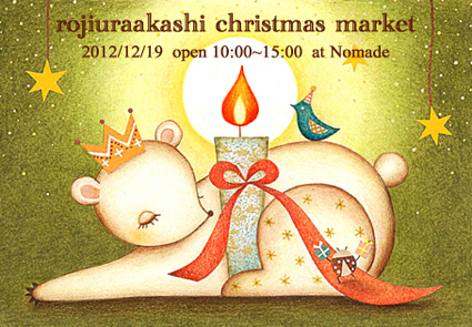 ●・○・●・○・●・○・●・○・●・○・●・○・●・○・●・○・●・○・●・○・●・○・●・○・●・○・●・○ 『路地裏明石クリスマスマーケット』 2012/12/19(水) 10:00〜15:00 *雨天中止 振替日12/20(木) (前日の天気予報21:00の時点で降水確率が60%以上の場合は中止) 会場:Nomade 兵庫県明石市大蔵天神町16-18 tel&fax 078-894-3801 ※駐車場はありませんので近隣のコインパーキングか 公共交通機関をご利用ください。 ★参加メンバー ・Nomade http://www2.ocn.ne.jp/~nomade/ ・non's house