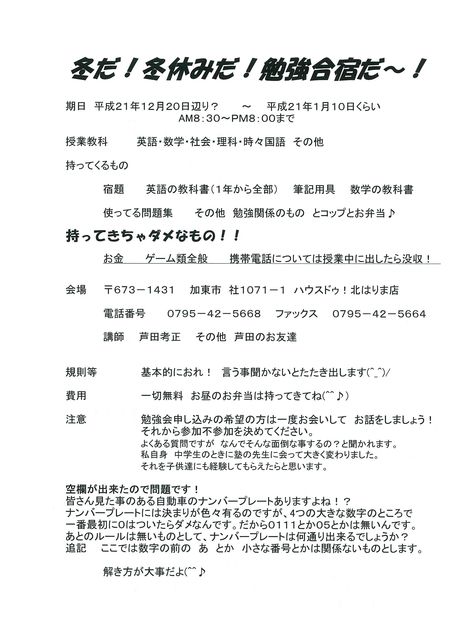 はじめまして。ハウスドゥ!北はりま店の芦田と申します。 なんだ??っとお思いでしょうが最後まで読んでいただけたらと思います。 加東市社の交差点のところににある不動産会社なのですが 毎年夏、冬、にボランティアで 勉強会というのをしています。かれこれ11年くらいになります。 今回は8月9日〜8月16日までの予定です。 元々 岡山の津山市出身なので岡山の生徒が多かったのですがご近所の方でご希 望の方がおられたらお越し下さいませ。 先生も同時募集です。(もちろんバイト代等はでませんが…)