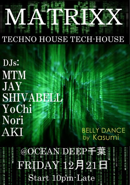 12月21日金曜日 MATRIXX @OCEAN DEEP TECHNO-HOUSE-TECHHOUSE Start 10pm- til close Entrance Free! Guest DJs SHIVABELL NORI YoChi Resident DJs AKI!!今回大阪から来ます!! JAY MTM Belly Dancer KASUMI!!! Beer/cocktails 500円 !! バーOcean Deep http://www.oceandeep.jp/ JR千葉駅西口(ホームの一番東京よりです) 出口より徒歩1分。 〒260-0031 2-1-5 Shinchiba Chuo-ku Chiba City 〒260-0031 千葉市中央区新千葉2-1-5 Tel 043-376-9000