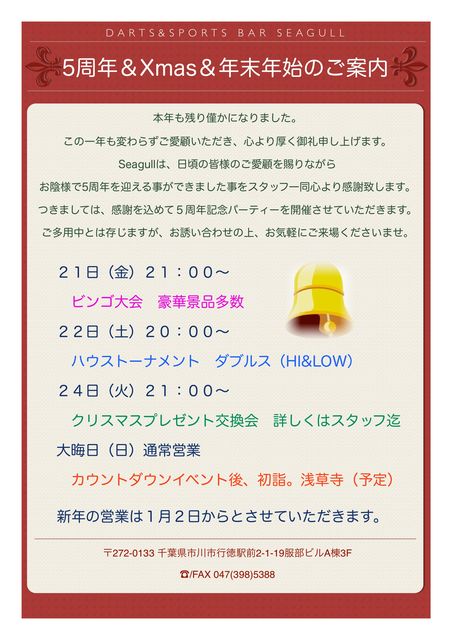 本年も残り僅かになりました。 この一年も変わらずご愛顧いただき、心より厚く御礼申し上げます。 Seagullは、日頃の皆様のご愛顧を賜りながら お陰様で5周年を迎える事ができました事をスタッフ一同心より感謝致します つきましては、感謝を込めて5周年記念パーティーを開催させていただきます ご多用中とは存じますが、お誘い合わせの上、お気軽にご来場くださいませ 21日(金)21:00〜 ビンゴ大会 豪華景品多数 22日(土)20:00〜 ハウストーナメント ダブルス(Hi&Low)