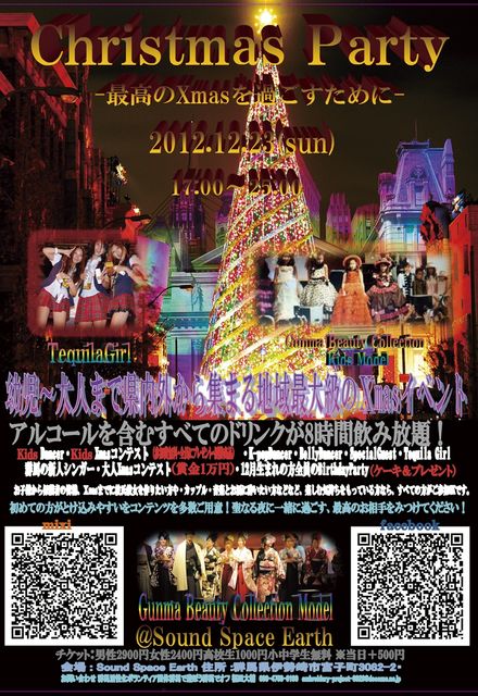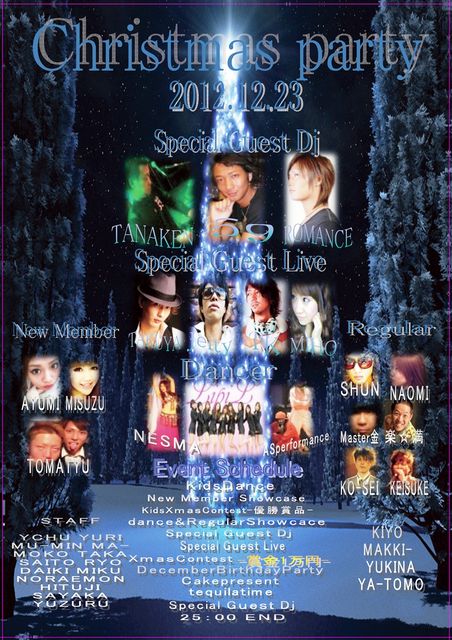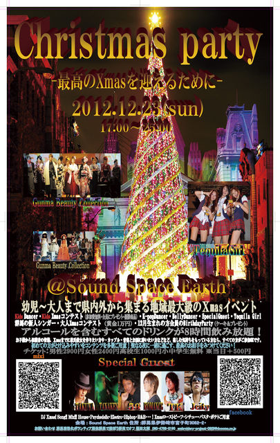 12/23(日)17:00〜25:00 EARTH 去年の動画みてください http://youtu.be/4UblRowRV4M 飲み放題8時間 参加コメントをしてくれた方500円引き 参加コメントをしてくれた方の料金 男性2900円、女性2400円 参加コメントなしの方は+500円 去年は150名 今年は300名を目指します 予定は Djマスター金の最高のHiphopからはじまり →KidsDancer →お子様Xmasコンテス