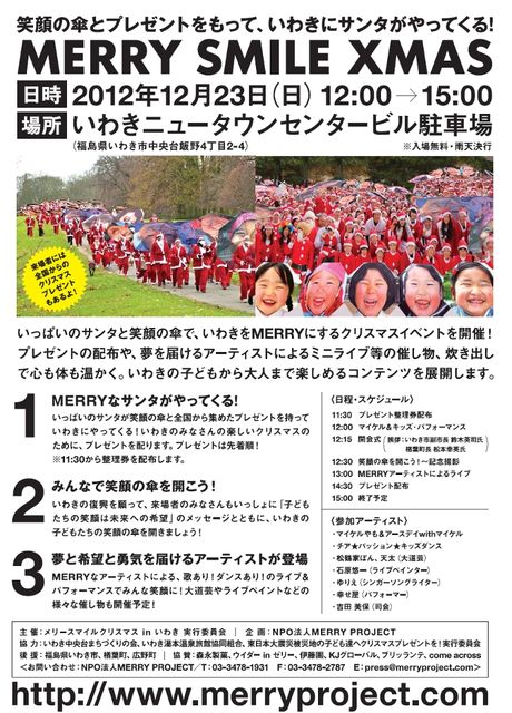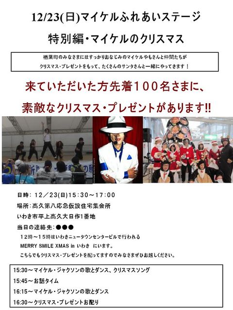 MERRY SMILE X’mas in いわき&マイケルふれあいステージ おなじみMERRY PROJECT主催により今年も 笑顔の傘で、いわきをMERRYにするクリスマスイベント https://www.facebook.com/events/448637258529481/ が開催されます。 夢を届けるアーティストによるミニライブ等の催し物や、炊き出しでいわきの子どもたちを笑顔にします。 また、たくさんのサンタ達と一緒にいつも訪問している楢葉町応急仮設住宅を訪れ、 マイケルふれあいステージを行い心温かいクリスマスをプレゼントします。 このイベントでアースデイwithマイケルのパ