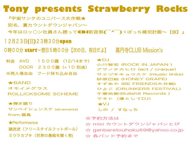 【現在の参加表明】 男性36名 女性31名 ☆☆☆☆☆☆☆☆☆☆☆☆☆☆☆☆☆☆☆☆☆☆☆☆☆☆☆☆☆☆☆☆ *DJ AICOH DJシューマッハの出演が確定しました。 全国億千万のサッズFANへ 今年最後のイベントがやってまいりました! スペシャルクリスマスナイトを開催致します。 巨大なパーティースペースを貸し切りします!! ステキな時間を皆サンと一緒に楽しみましょう! 当日はアルコール、ソフトドリンク飲み放題と ビッフェフードご用意しています。 コスプレでの参加もお待ちしています。 宜しくどうぞ。 ☆