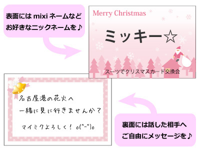 12月23日現在の応募状況は、 男性:25名、女性:22名です クリスマスカード作成のため受付は本日16時まで 12月23日スーツでクリスマスカード交換会のお知らせです 今回はニックネーム入りのクリスマスカードを1人20枚ずつお渡しするので、参加者全員で交換し合い、早く全部交換した人からプレゼントがもらえるドキドキワクワクのイベントです ただ交換するだけじゃおもしろくないので、ルールを決めます 「裏面に必ずメッセージを書いてもらう事」 メッセージのないカード