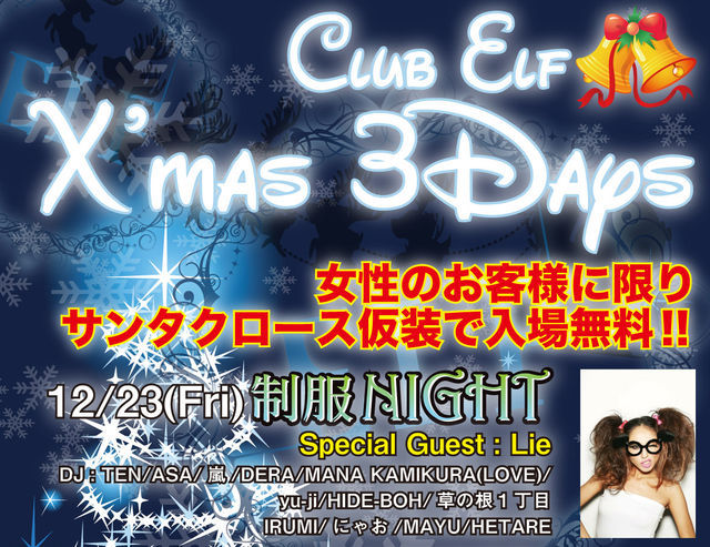 超豪華なゲストが出演で金曜日渋谷一の盛り上がりを見せる FLFの「PARTY FRIDAY」 毎月第4金曜は制服ナイト 今回はクリスマスバージョン 前回の写真です http://ameblo.jp/ikarashi1983/entry-11081253209.html コミュも入ってください! http://mixi.jp/view_community.pl?id=5782604 女性のお客様に限りサンタクロース仮装、制服&コスプレor持参でエントランスフリー(男性はディスカウント) SPECIAL GUEST 人気カリスマモデルのLieが登場