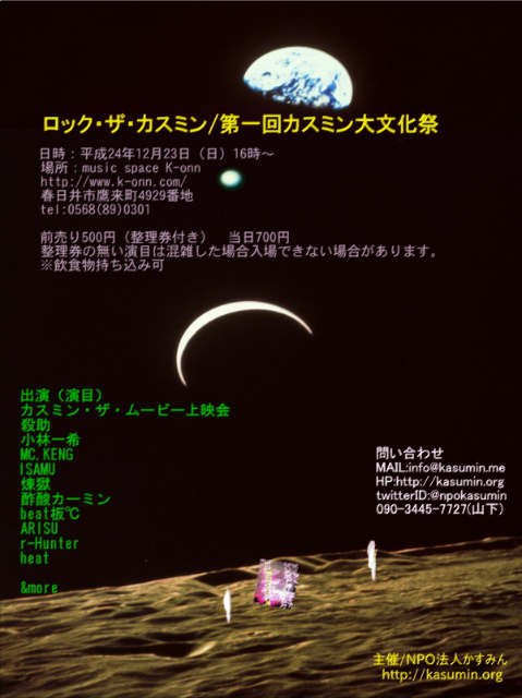 管理人様、 告知失礼致します! 正確には名古屋市内ではなく春日井市で開催のイベントですが宜しくお願い致します! NPO法人「かすみん」が 主催の地域の文化交流を 目的に開催のカスガイカルチャー文化大発信祭! 高校生が中心(高校生とのコラボ)のイベントです! 当イベントは様々なステージ 音楽(バンド、弾き語り、ピアノ等ソロ演奏、ラップ)やパフォーマンス、ダンス、寸劇、映像作品上映の他にも会場内ではアート作品の展示も有る等、盛り沢山な内容のイベントです! ■12/23(日) 【題】『ロック・サ
