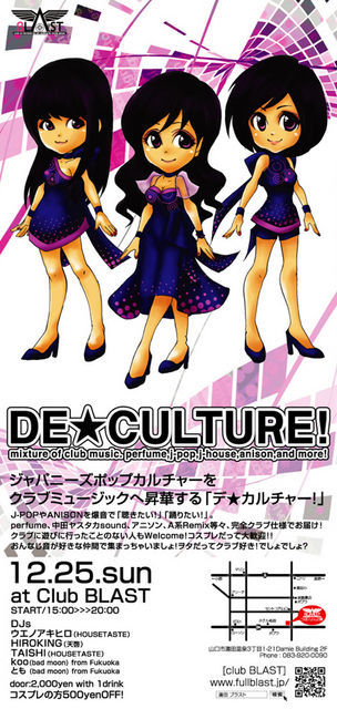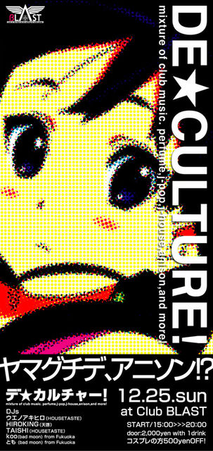 DE★CULTURE! 12.25.sun at BLAST(山口市湯田温泉3丁目1-21Damie Building 2F) http://www.fullblast.jp/ 15:00〜20:00 DJs ウエノアキヒロ(HOUSETASTE) HIROKING(天啓) TAISHI(HOUSETASTE) koo(bad moon) from Fukuoka とも(bad moon) from Fukuoka door:2,000yen with 1drink コスプレの方500yenOFF! ジャパニーズポップカルチャーをクラブミュージックへ昇華する「デ★カルチャー!」 J-POPやANISONを爆音で「聴きたい!」「踊りたい!」。 アニソン、A系Remix、perfume、中田ヤスタカsound等々、完全クラブ仕様でお届け!