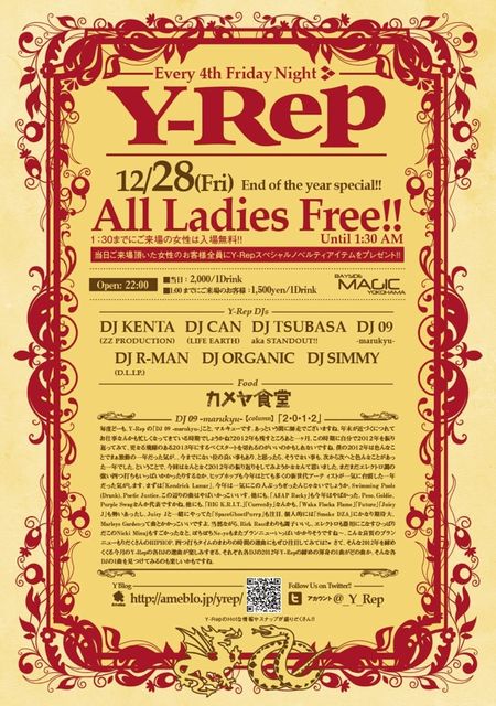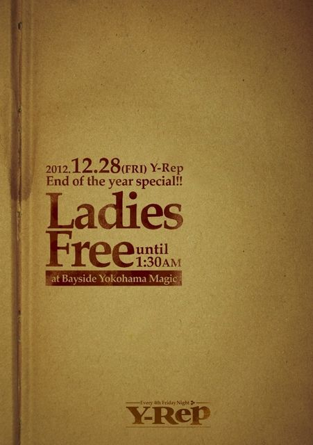 管理人様、告知失礼致します。 12/28(金) Y-Rep End of the year special!! @ Bayside Yokohama Magic Open 22:00〜 ★★★★★★★★★★★★★★★★★★★★ 入場の際にエントランスにて 【 シミーのゲスト】 と伝えるだけで通常だと2000円のところ -------------------------------------- ゲスト料金 女性: 入場無料 (1時半以降 \1,000/1d) 男性: \1,000/1d -------------------------------------- と大変お得な料金で何名様でも入場できます! お気軽にご利用下さい♪ (このペー