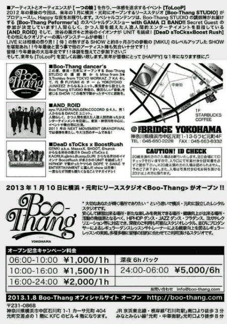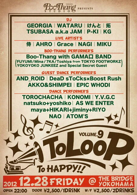 Boo-Thang STUDIO PRESENTS 2012.12.28(金) ToLooP vol.9〜To HAPPY〜 @THE BRIDGE YOKOHAMA 22:00 OPEN DOOR:\2,500/1drink W/F:\2,500/2drink's ■DJ■ GEORGIA WATARU けんと 拓 TSUBASA a.k.a JAM P-KI KG ■LIVE Artist's■ 侍 AHRO Grace NAGI MIKU ■Boo-Thang Peformer's■ Boo-Thang with GAMA口BAND (FUYUMI/Mina/7KA/Toshiya from TOKYO FOOTWORKZ/YOKOYOKO JUNKEEZ and Special Secret Guest) ■GUEST DANCE Peformer's■ AND_ROID DeaD sToCks×Boost Rush AKKO&SHIMPEI EPIC WHODI ■DANCE Pe
