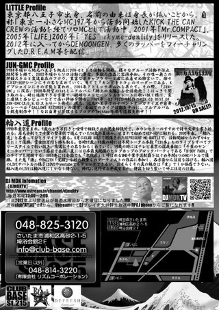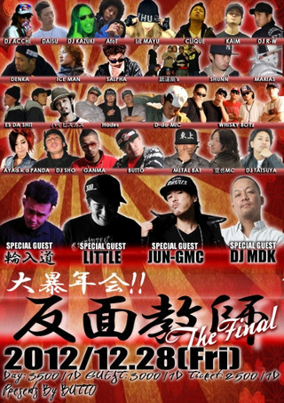 今夜は浦和BASEにて!!☆★☆ LITTLE(元KICK THE CAN CREW)出演! BUTTO Presents 「〜反面教師第ファイナル&大暴年会スペシャル〜」 開催です”!! 超、超、超 大ボリュームの 忘年&ラストスペシャル!! ラップ好きからクラブ好きまで 見逃し厳禁!! スペシャル ゲスト ◆LITTLE(元KICK THE CAN CREW) ◆JUN-GMC ◆輪入道 ◆DJ MDK 大大大ボリューム で 開催します(^O^)!! 浦和BASEのエントランスにて