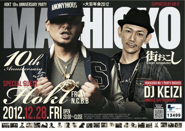 管理人様告知失礼します。 大忘年会スペシャル 2012 12月:極 月 2012年は、北海道内、札幌・旭川・帯広・室蘭・苫小牧・北見 6箇所 BLOW UP,ICEAGE,SOO WOO!,JOIN THE CLUBの別企画、その他の企画・制作で 昨年の約14,000名を大幅に上回り、16,000名を突破し、皆様のご理解・ご協力、 そして、多大なる好奇心と、遊び心により、飛躍的な1年となったことを感謝しております。 ありがとうございます。 今年最後の毎月最終金曜日@SAPPORO alife”街おこし aka マチオコ“は、 デビュー10周年を迎え、この1年に2枚のア