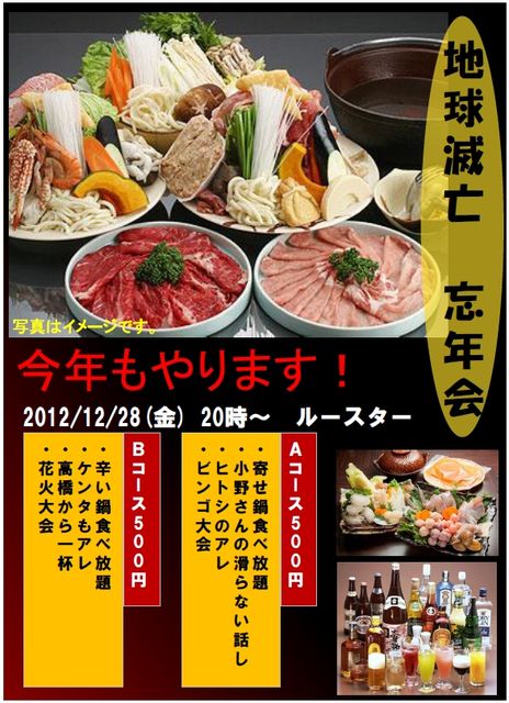 地球滅亡しなかったので・・・ 『ルースター忘年会』開催します!ヽ(^○^)ノ 鍋を囲んで 〜2012年の反省と来年の抱負を語る会〜 今年はルースター10周年yearということで、春先からたくさんのイベントを企画させていただき、とても充実した一年だったと満足しております! これも皆様のご協力があってこそだと思う次第です!本当にありがとうございました(*^ー^)ノ♪ 今年も麻美ゆまにも会えました(笑) うんうん(^w^) 今年のルースターの新たな展開としては、お笑いライブやレゲエイベントなど、花見やパーティーもとても楽しかっ