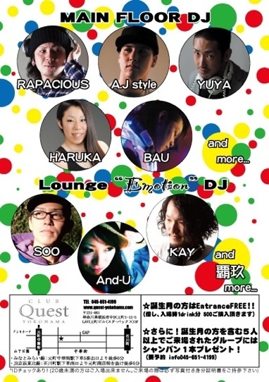 管理人様、告知失礼します! 横浜の第4金曜といえばこれ ☆☆『TWISTER』@club Quest☆☆ 都内・横浜を中心に各方面で活躍中のDJが定番のHIP-HOP/R&Bから最新のHIT TUNEまで幅広く朝までノンストップMIX 横浜を代表するclub Questの最高の音質とDJ陣の繰り出す良質な音でどの時間帯でも必ず楽しんでいただけます そしてラウンジフロアでは旧譜を中心に往年の名曲からコアな名曲まで余すとこなくお届けします この2つの異なる