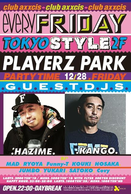 今夜、axxcisにて金曜日恒例PlayerzPark開催しています!! GESTDJには、HAZIME,KANGO エントランスにて 『ファニーティのタカシ』で 1時まで男性1000/ND、女性100/2D 1時以降は、男女共に1500/1Dのディスカウントでのご案内になります 身分証の確認がありますにでIDをお忘れなく。