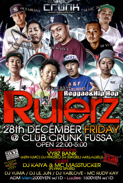 埼玉中心に各地で活躍中のReggae Sound“VYBZ BANK"、さらに横浜を中心に全国各地で活躍するDJ KAIYA、そして横浜最大級のビッグパーティー“TIKATIKA CASTLE"の仕掛け人でもでもある“MC MASS TUCKER"もゲストに迎え、普段のCLUB CRUNKとはまた一味違った雰囲気をお楽しみください☆ ━━━━━━━━━━━━━━ 祝前日SPECIAL 『RULERZ』 Presented by CRUNK Entertainment ━━━━━━━━━━━━━━ ▼日程▼ 2012年 12月28日(日) 22:00-5:00 ▼会場▼ CLUB CRUNK福生 http://www.clubcrunk.com/ ▼入