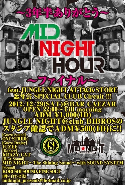 MID NIGHT HOUR FINAL〜3年半ありがとう〜 今回のMID NIGHT HOURはスペシャル企画として 毎月第五土曜日にCLUB BIBROSで開催されるJUNGLE NIGHTとコラボ!! 愛媛ではめずらしいクラブサーキット形式です!! MID NIGHT HOURは当日入場料\1000-1D付きですが、 JUNGLE NIGHT@CLUB BIBROSのスタンプ確認で 入場料が\500-1D付き!! MID NIGHT HOURの入場スタンプ確認で JUNGLE NIGHTの入場料が\2000-3D付きから\1500-2D付きに!! MID NIGHT HOUR FINAL〜3年半ありがとう〜、 JUNGLE NIGHT Attack Store忘年会Special どちらもおもいっきり楽しみま