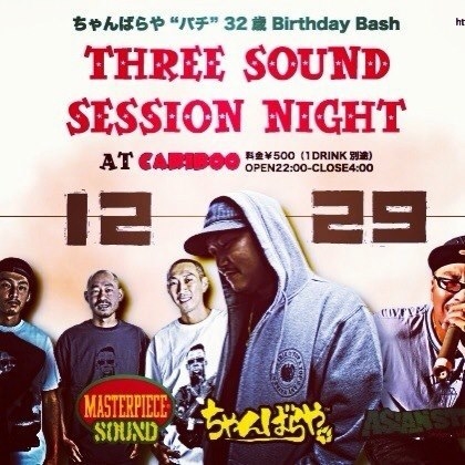 CHAMBALAYA BIRTHBAY BASH 「THREE SOUND SESSION NIGHT」 OPEN 22:00 - CLOSE 4:00 @CARIBOO ADM:\500 (ドリンク別途) CHAMBALAYA MASTERPIECE ASIANSTAR