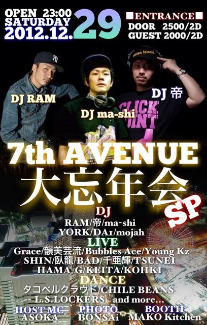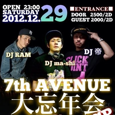 管理人さま失礼します。 12/29(土)セブンス大忘年会開催します!! 今年一年 何回もセブンスに遊びにいった人も! たまたま遊びにいった人も! 出演した人も! ついつい行かなかった人も! みんなで大忘年会しましょー!! イベントを盛り上げてくれた様々なアーティスト、DANCERに加え、 DJ陣も 六本木Fancy(VANITY)などで活躍中の『RAM』 ご存知! 横浜トップDJ 『帝』 PIONEER Resident DJ『ma-shi』 様々BIG PARTYを盛り上げてる豪華メンバーが最高の音楽で皆さまをお迎えいたします!! 今年最後
