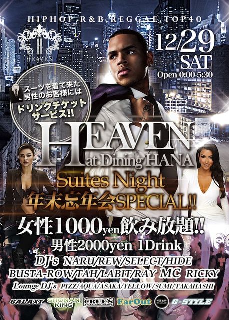 12.29(土)横浜駅から徒歩3分以内!!女性\1000円飲み放題!!横浜、都内の実力派DJが楽しめる新しい横浜の夜の遊び!! 毎回満員御礼の年末大忘年会SP!!今回は男性にも特典あり!! "HEAVEN" 年末スーツナイト!! イベントスナップはこちら!! http://ameblo.jp/dj-rew/entry-11198476852.html http://www.dj-rew.com/ 2011年10月から始まって以来、毎回満員御礼と今話題の大人の為の ラグジュアリーパーティー“HEAVEN” 横浜駅から歩いて3分以内の好立地に六本木、渋谷、そして横浜の クラブシーンに精通する人気DJ陣が