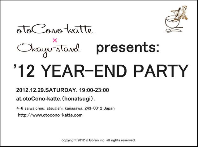 あどもー。 某兄ぃにセカサレ とりあえずトピたて。 29日はkatte.の忘年会だよー。 あけといて っていうか 参加しましょー。 で あんまり大人数だったら・・・ 『Okayu−stand.』でやっちゃうかもかも?! あっちなみに この日 長年連れ添った(笑)マーロ☆ヒロ 最終日ね。