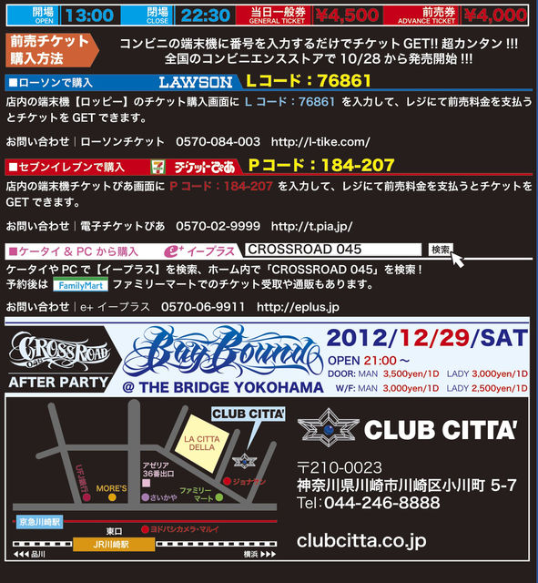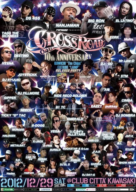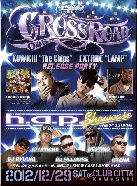 管理人様、告知失礼します。 今年はCROSSROAD 045 10周年!!! 年末の神奈川の風物詩、毎回大盛況を見せる[CROSSROAD 045] ステージ上には恒例のIMPALA、LOW RIDER BIKEの展示 エントランスには各SHOPの物販ブース フードブースはBOND&JUSTICEが出店 CROSSROAD 045の10周年記念イベントで 川崎出身KOWICHIのソロデビューアルバム 「THE CHIPS」 10月17日に発売したEXTRIDEの 「LAMP」 のRELEASE PARTY!!! 今年はh.g.p. SHOW CASEが復活! 進化したメンバーが当時の熱いSHOW CASEを繰り広げる!!! 出演アーティストも10周