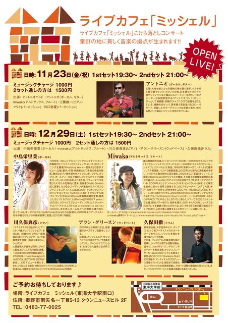 ライブカフェ「ミッシェル」こけら落としコンサート 秦野の地に新しく音楽の拠点が生まれます!! 日時: 12月29日(土) 1stセット19:30〜 2ndセット 21:00〜 出演: 中島えりな(ボーカル) miwako(アルトサックス、フルート) 川久保典彦(ピアノ) アラン・グリースン(ウッドベース) 久保田徹(ドラム) 場所:ライブカフェ ミッシェル(東海大学前) 住所:秦野市南矢名一丁目5-13 タウンニュースビル 2F TEL :0463-77-0025 ミュージックチャージ1000円 2セット通しの方は1500円 ご予約お待ちしております♪
