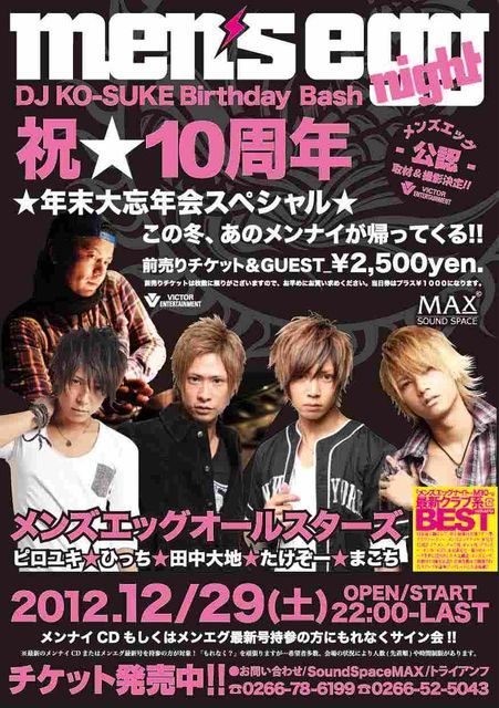 ついに、今年最後の ビッグイベントが決定 ★メンズエッグナイト★ 10th Anniversary tour in NAGANO 年末大忘年会スペシャル 〜DJ KO-SUKE Birthday Bash〜 スペシャルゲストは 史上最多の5人!!! ★メンズエッグ★ オールスターズ!!! たけぞー、まこち 諏訪初参戦!! さらに!!田中大地、ひっち DJピロユキと超豪華メンツ!! モデル私物、2ショット写真、 サイン入り10周年記念グッズ など超豪華景品が当たる 大抽選会も開催決定!! メンナイCDもしくはメンエグ 最新号持参の方に もれなくサイン会!! 2012
