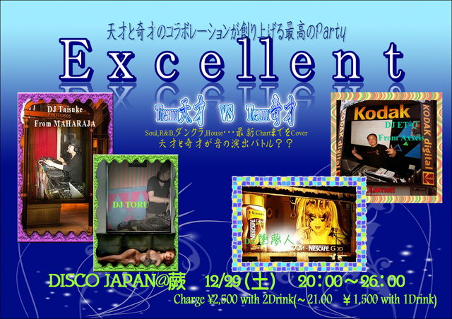 天才と奇才のコラボレーションが創り上げる最高のParty 20年以上の現場経験を持つ二人のベテランDJが単に昔を復活させるのでなく、堕夢人の魔力により過去を現代をGateway。 新たなスタイルとしてDISCOを再生。 - Excellent - Date:2012/12/29(Sat.) Time:20:00~26:00 Place:DISCO JAPAN@蕨 ※蕨駅東口階段を下りて線路沿いを歩いて1分 Charge:¥2,500with 2Drinks(~21:00 ¥1,500 with 1Drink) ジャンル:ALL Mix(昔から今まで)^^ DJ's DJ ET-Q(新宿Axxcis) DJ Taisuke(MAHARAJA六本木
