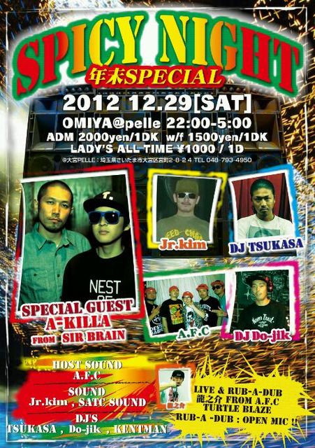 毎第五土曜日開催SPICY NIGHT です。 今回は忘年会SP & DJ Do-jikのbirth day bash !! 詳細は下記の通り! 2012年12月29日(土) 大宮PELLE 22:00 ~ 5:00 DOOR \2000/ 1d w/f \1500/1d 女性はALL TIME \1000/1d REGGAE,HIPHOP,RB,,,All good music 【GUEST SOUND】 A-KILLA fr SIR BRAIN 【HOST SOUND】 A.F.C 【SOUND】 Jr.kim SATC SOUND 【DJ's】 Do-jik TSUKASA KENT-MAN 【RUB-A-DUB】 龍之介 TARTLE BLAZE OPEN MIC !! 飛び入り歓迎!! SPICY NIGHY年末忘年会スペシャルです! おいしいお酒と
