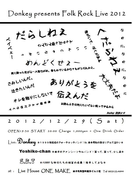 米子のフォークロックバンド、Donkeyが毎年恒例の年末ライブをやります〜。 ぜひお越しください! いっしょにお酒を飲みましょうね。